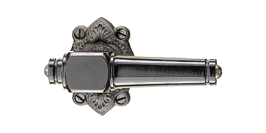 En klassikker fra Søe-Jensen & Co. Dette dørgreb er nærmest indbegrebet af københavnske boliger. Et såkaldt efterkrigstids dørgreb produceret på baggrund af manglende råmaterialer. Rosetter og nøgleskilte er også i dag sandstøbte i jern og sort patineret, præcis som første gang de blev produceret efter krigen.