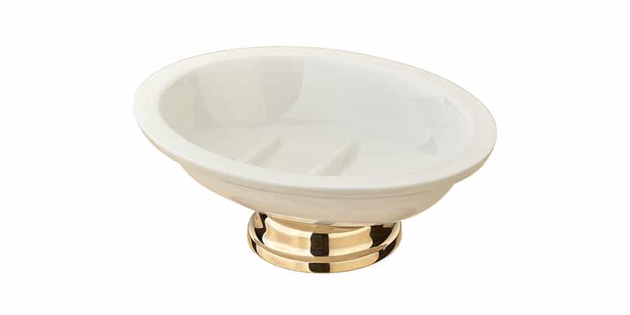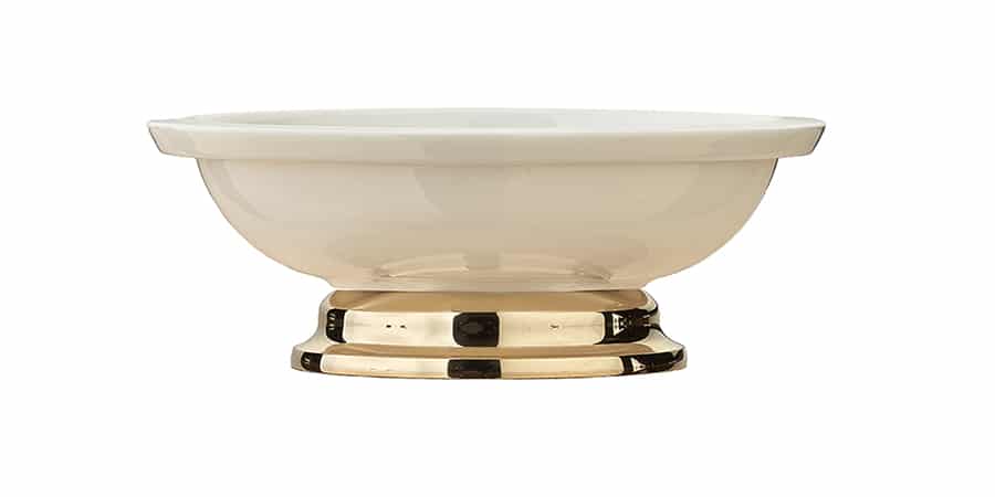 Den klassiske sæbeskål fra Søe-Jensen, med keramikskål i høj kvalitet, her vist i messing. Den tilbydes i messing og krom som vist på foto.